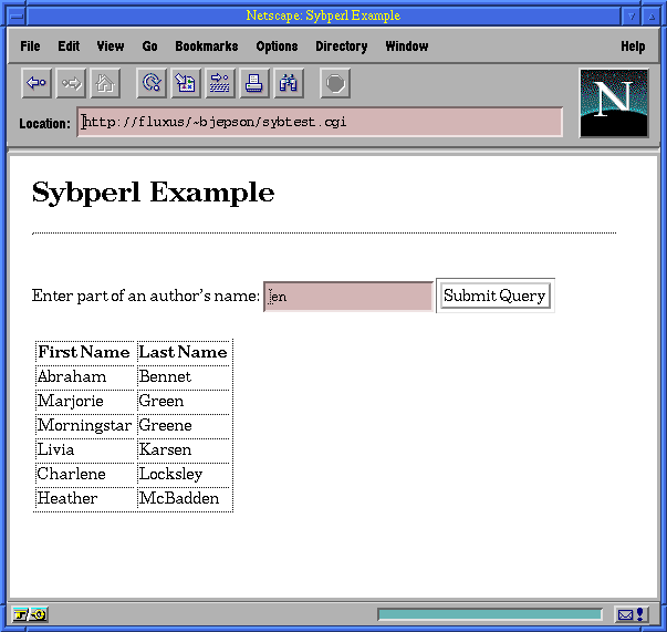 Getting back to Mr. Fiction's problem, we need to answer a big question; How can we connect a Linux web server to Sybase? If you've done a lot of CGI programming, you've probably, but not necessarily, used a little bit of Perl. Perl is an excellent tool for CGI development; its modular design makes it easy to extend. In the examples which follow, we'll see how to use the CGI module in conjunction with Sybperl. Combining these tools, we'll be able to easily build CGI applications that can connect to an SQL Server database.