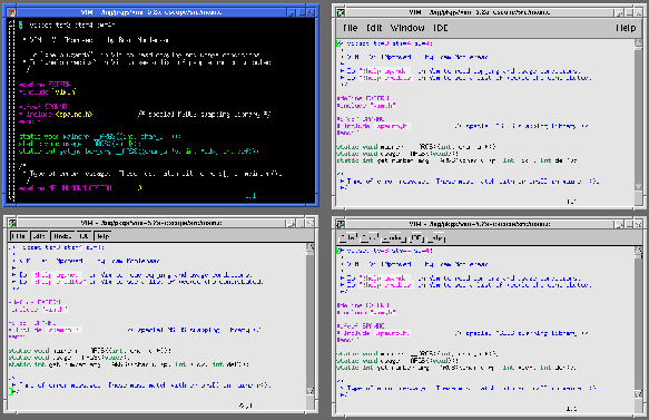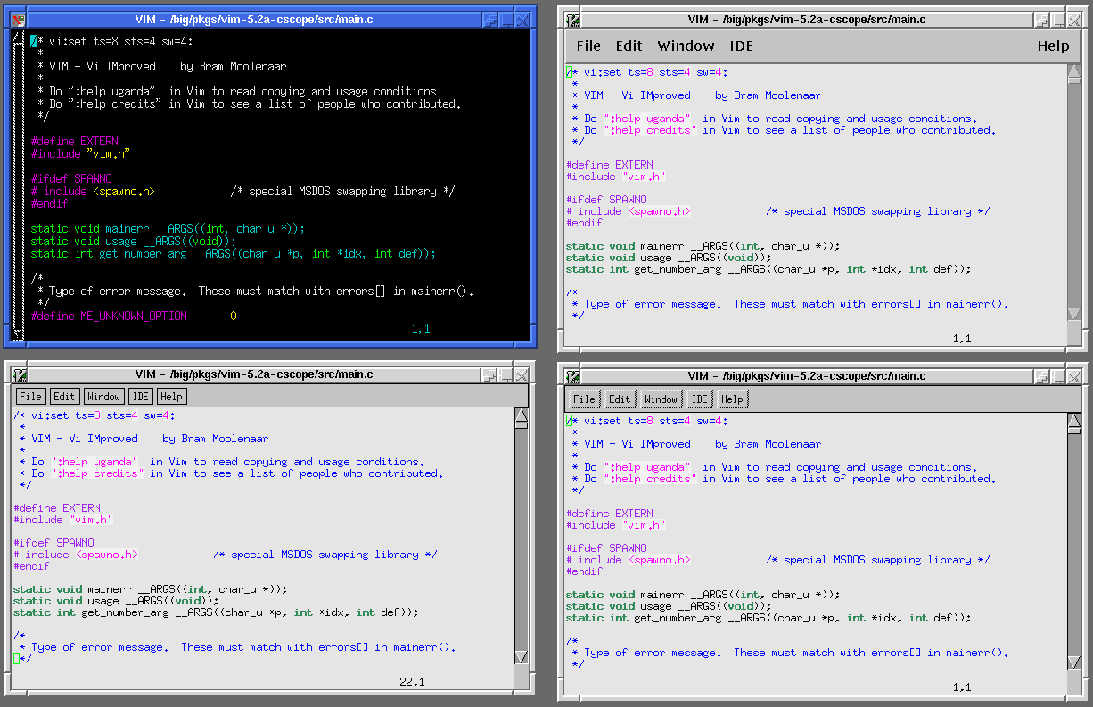 Here is a BIG screenshot of the Unix version of vim with four different looks (vim in an xterm, vim using Athena, vim using Athena with Xaw3d, and vim using Motif (for Linux users, Vim also works with Lesstif)). Click on the image for the full size version: