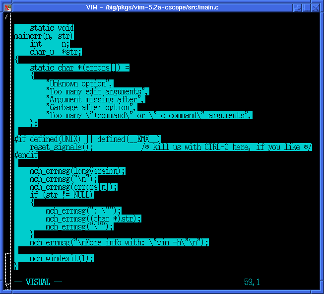 Personally, I found the syntax highlighting to be one of the most useful features of vim. Syntax highlighting (or coloring, as some may call it), colors text according to their attributes. For editing code, this allows you to have different colors for commented text, keywords, numbers, etc. You may not think much of it, but believe me, after staring at code for long periods of time, all the text on the screen starts looking pretty much the same. It certainly helps to have some color differentiate between actual code, and comments in the code! A picture is worth a thousand words, so here's a screen shot of my vim setup editing main.c from the vim source: